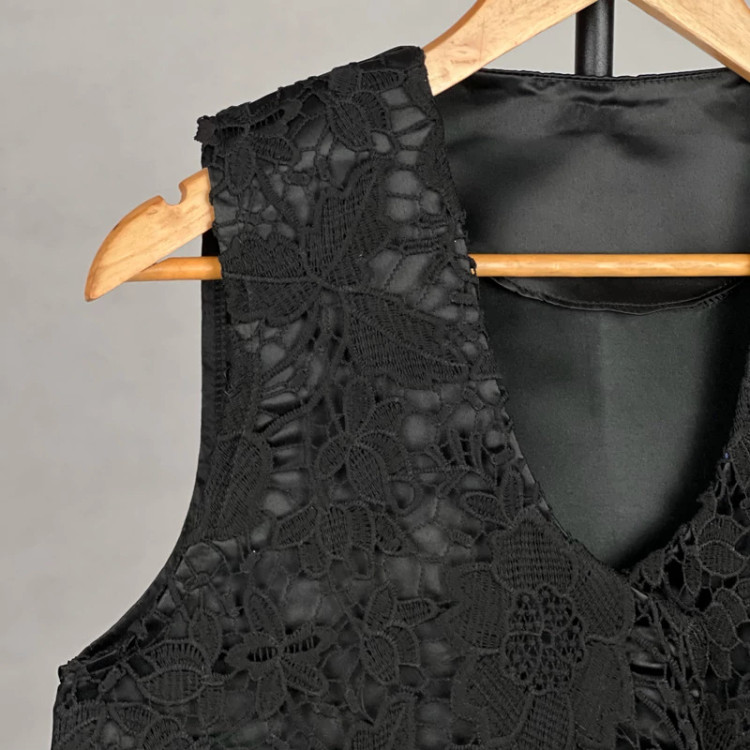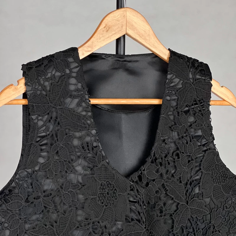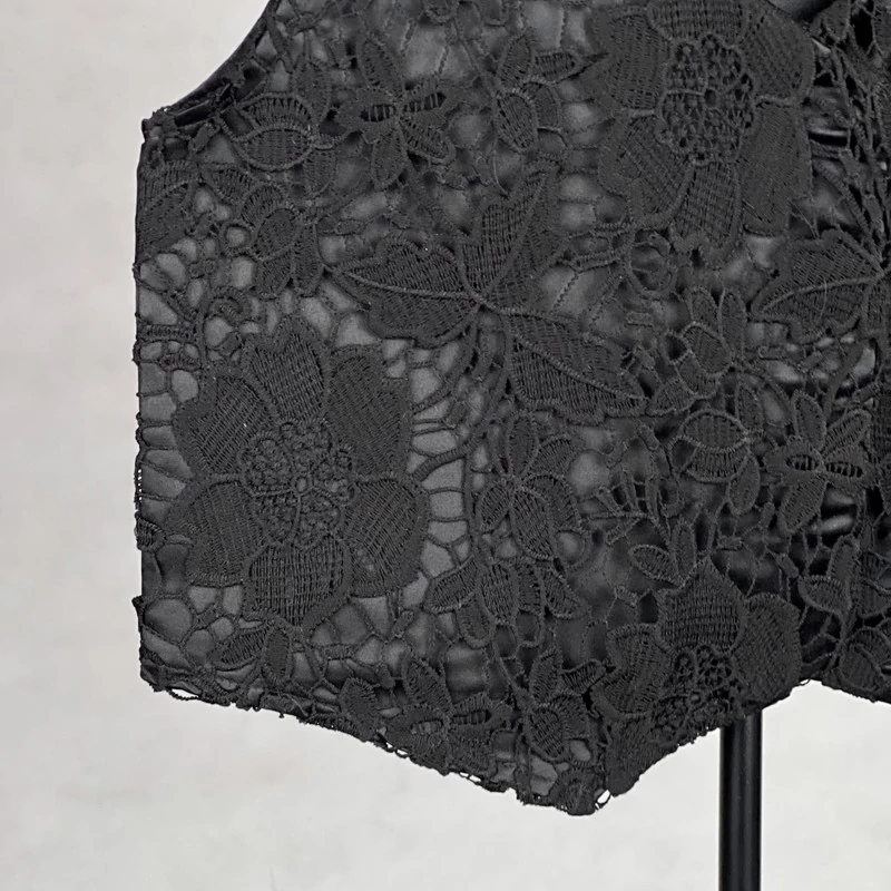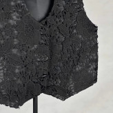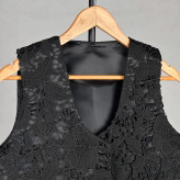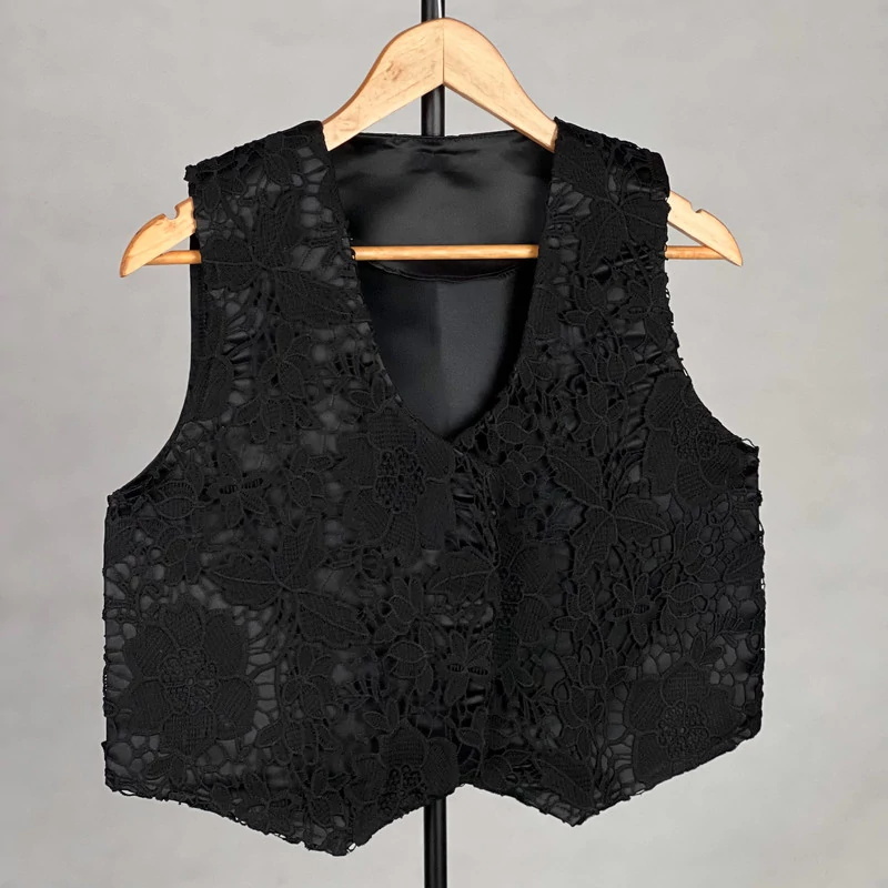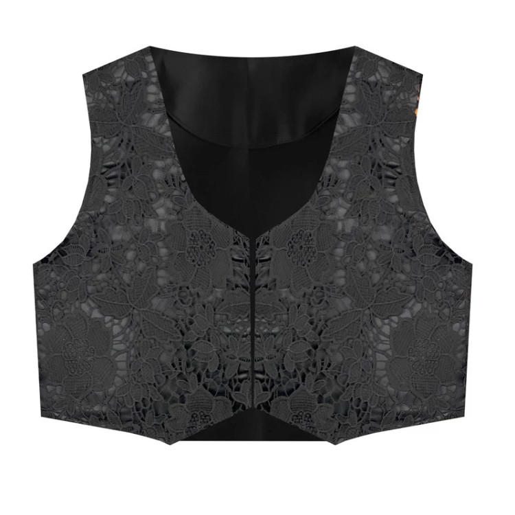 جلیقه زنانه ، با بدنهای از دانتل گلدار برجسته ، انتخابی ایدهآل برای استایلهای رومانتیک مجلسی است . پشت کار از پارچه ساتن است. این وست کوتاهقد با قد ۴۵ cm، به خوبی روی پیراهنهای ساده یا شومیزهای مجلسی مینشیند.