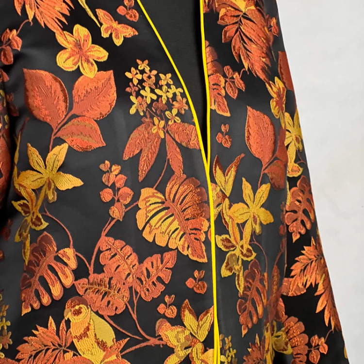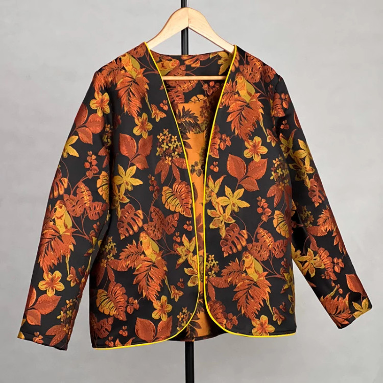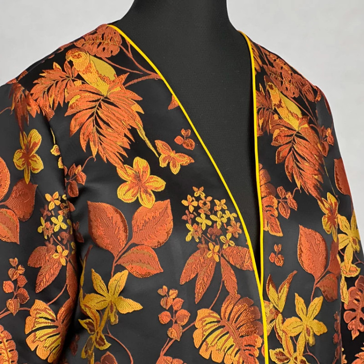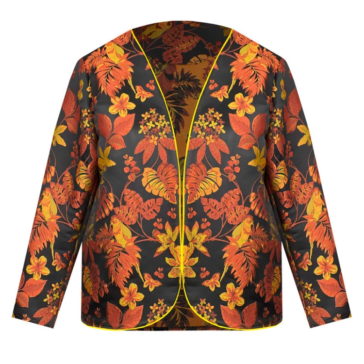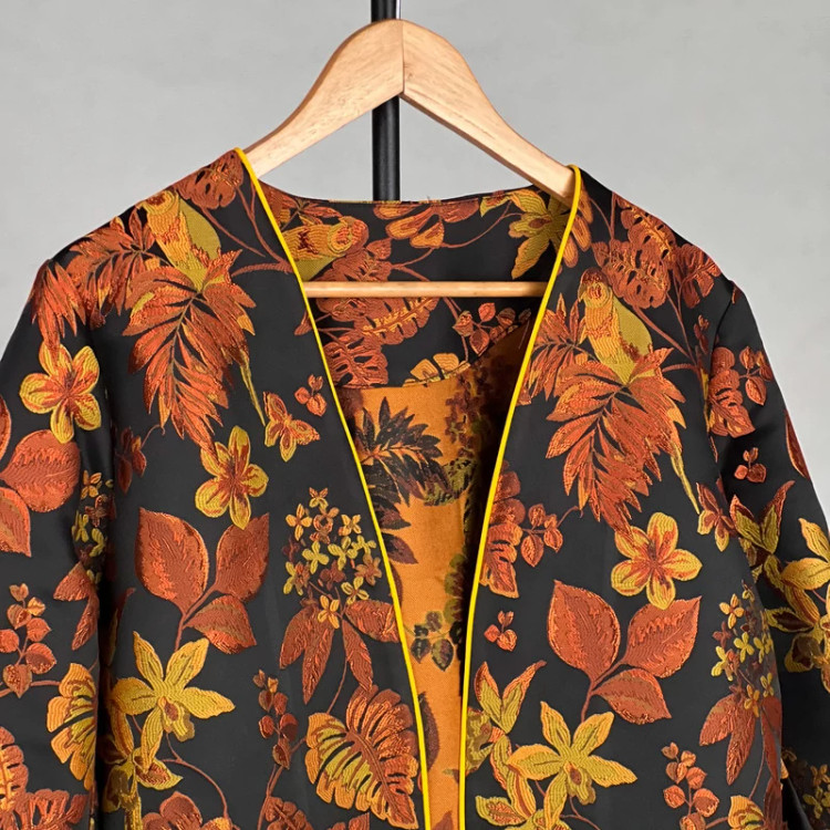 یک کت مجلسی کوتاه و شیک که از پارچه ژاکارد طرحدار تهیه شده است. پارچه ژاکارد که به دلیل طرحهای برجسته و بافت خاص خود، برای لباسهای مجلسی بسیار مناسب است. طرحدار بودن پارچه، به کت جلوه ویژهای میبخشد. قد کت 70 سانتیمتر که یک قد نسبتاً کوتاه است.مناسب برای مهمانیها، مجالس رسمی و نیمهرسمی. این کت را میتوان با انواع دامن، شلوار و کفش پاشنهبلند ست کرد.