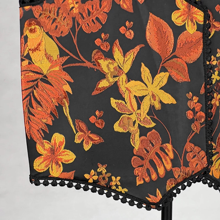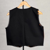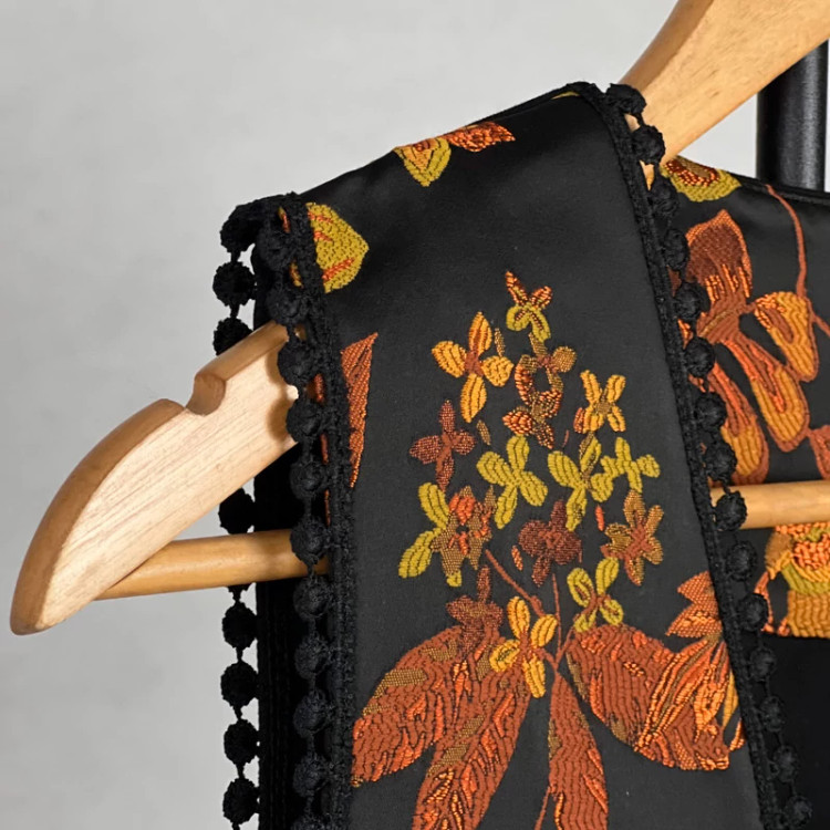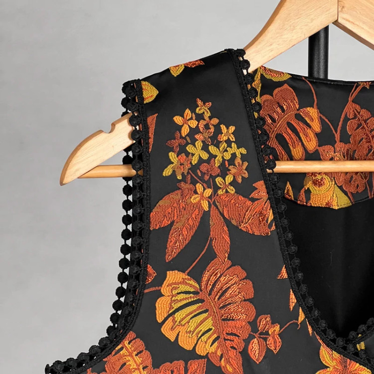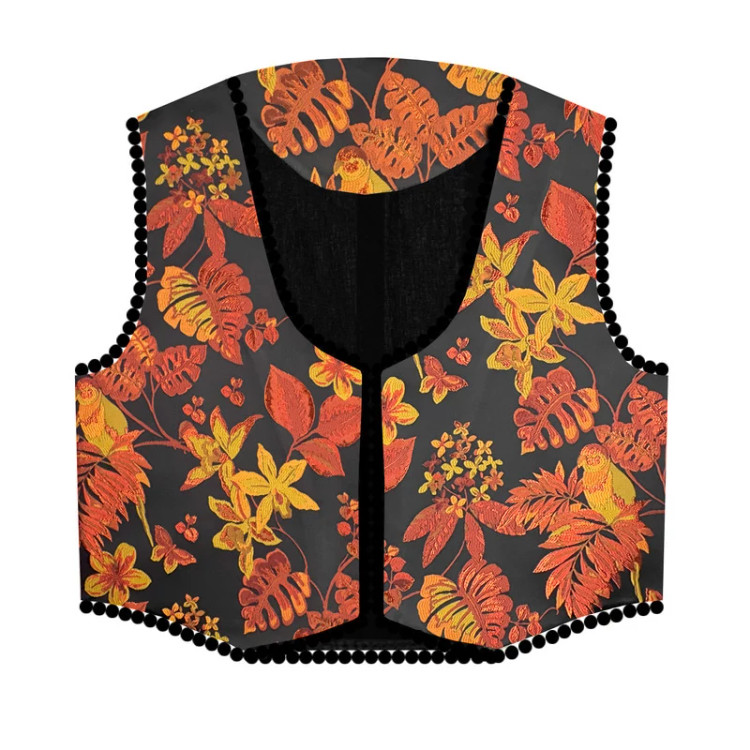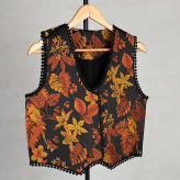 این جلیقه با جلوهای درخشان از طرحها و نقوش پارچه ژاکارد ، ترکیبی از لطافت و شکوه را نمایش میدهد. جلوی کار با پارچه ژاکارد و حاشیه آن با نواردوزی عدسی آراسته است تا جلوهای چشمگیر داشته باشد. پارچه ژاکارد به دلیل طرحهای برجسته و بافت خاص خود، برای مناسبت های مجلسی است. پشت کار از پارچه کتان دوخته شده تا فرم ایستایی و راحتی فراهم شود. قد ۴۵ سانتیمتری آن، این مدل را مناسب استفاده روی شومیز یا پیراهن مجلسی کرده است. این جلیقه انتخابی است برای بانوانی که سادگی را در کنار درخشش جزئیات میپسندند.